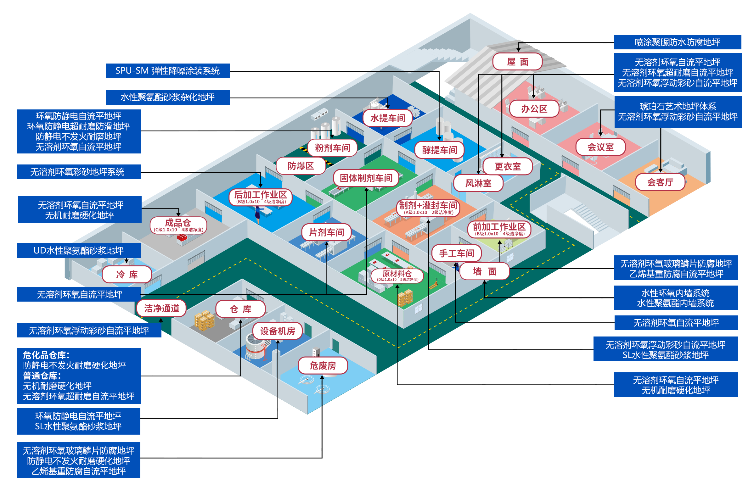 包括化學(xué)藥,中成藥,生物制藥和血液制品等細(xì)分類目,以GMP車間標(biāo)準(zhǔn)要求,對(duì)不同類型的車間提供不同的地面涂裝解決方案。