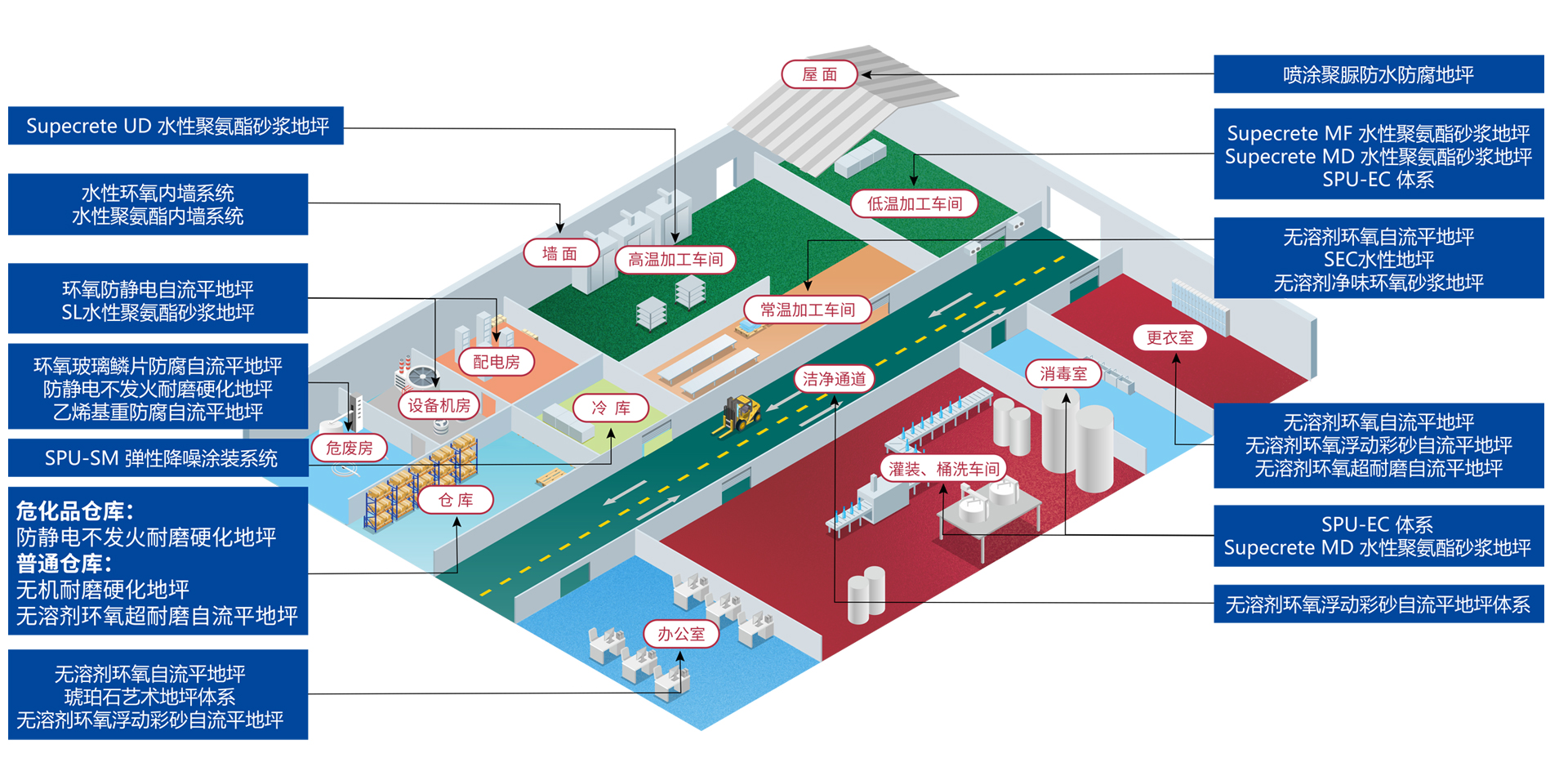 食品加工車間各類繁多,食品安全是第一標準,使用的地坪材料要符合食品安全要求,不同的生產(chǎn)工藝對地面功能的要求也不一樣,有耐高低溫,耐乳酸,果酸腐蝕,耐水洗,耐高溫蒸汽等。
