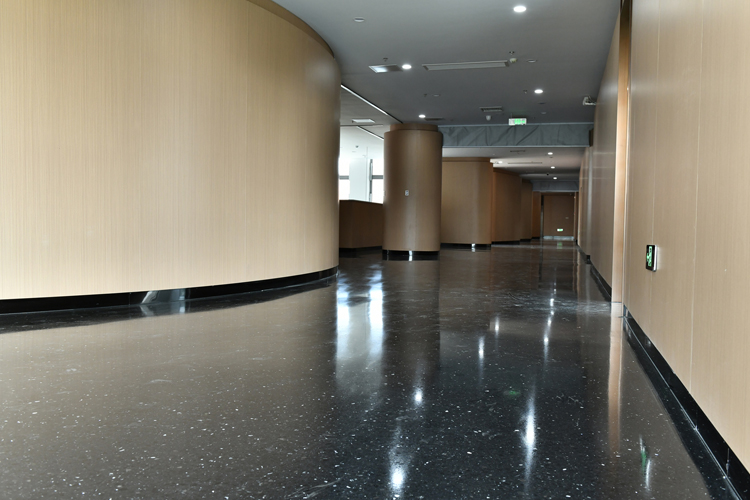渤??萍即髮W(xué)9號樓大廳、走廊,以及體育場館看臺、走廊、內(nèi)廊等均由秀珀SET 琥珀石藝術(shù)地坪系統(tǒng)打造。
