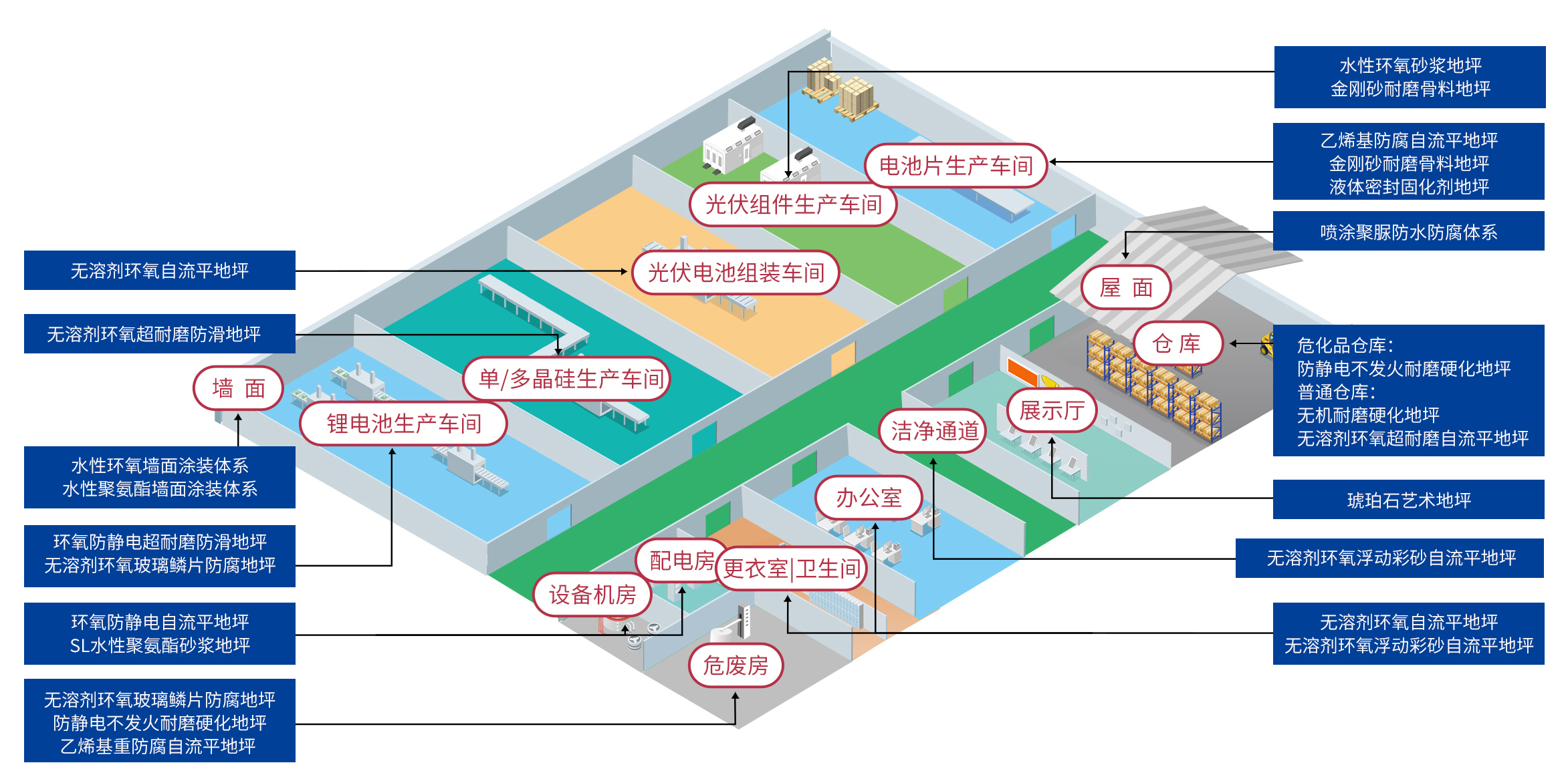 包括了光伏,鋰電等新能源產(chǎn)業(yè)。制造工廠從單\多晶硅,到太陽能面板,組件,鋰電池生產(chǎn)等。工廠對(duì)在地面的要求也不盡相同,大致可分為耐磨抗壓、防導(dǎo)靜電和防腐等主要需求